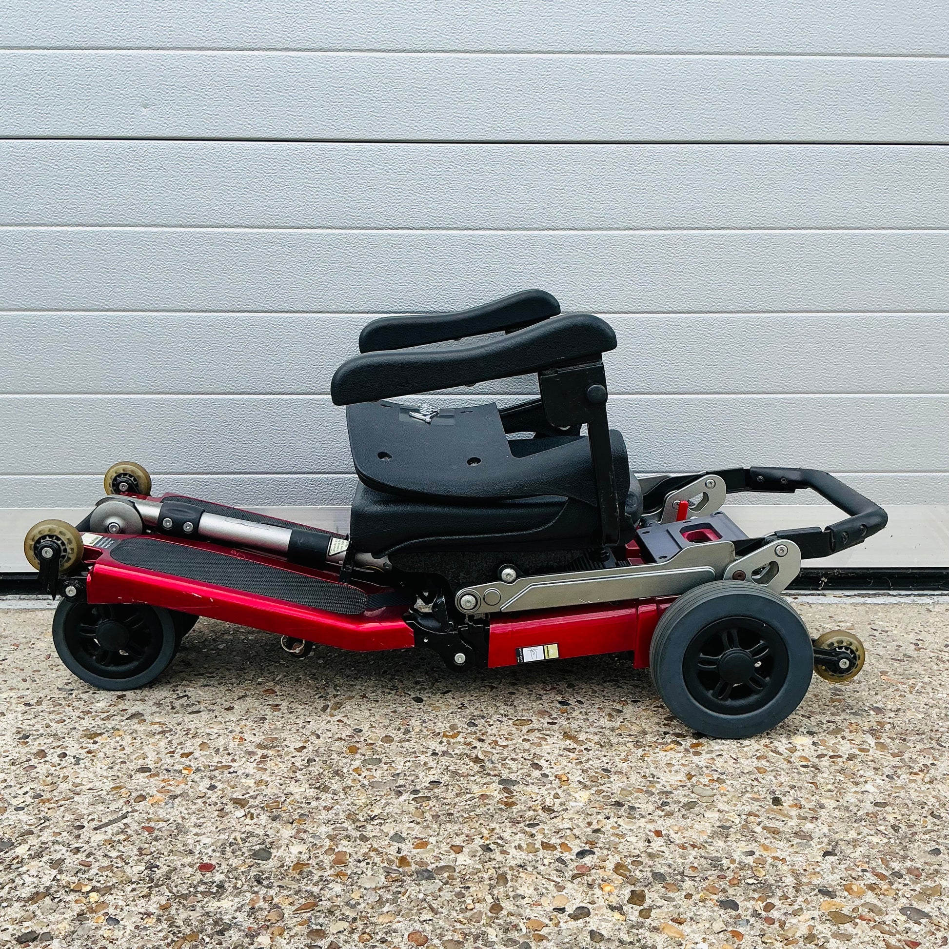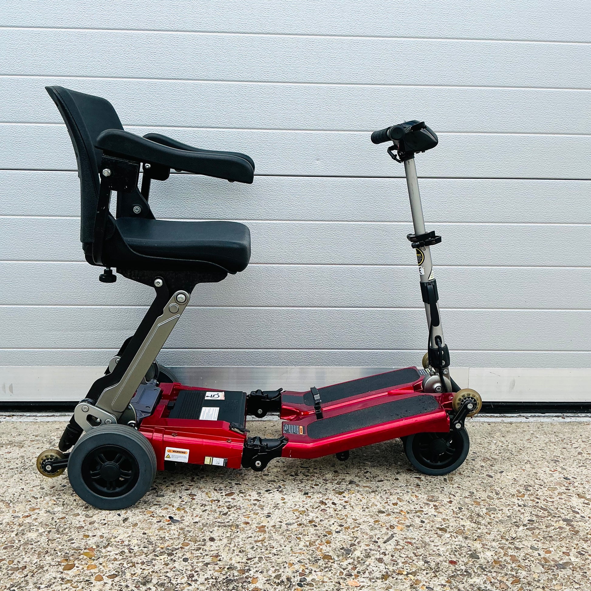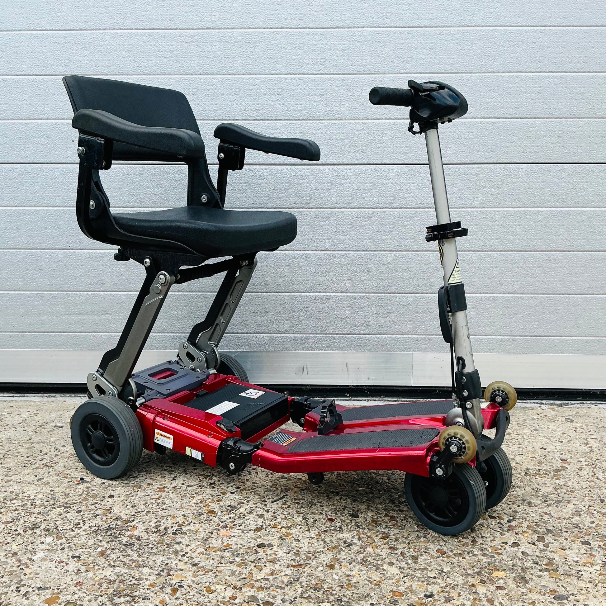 Freerider Luggie, a transportable manual folding 4 mph pavement mobility scooter that comes fully tested with the charger, optional armrests, tested Lithium battery and a 3-month warranty included.
