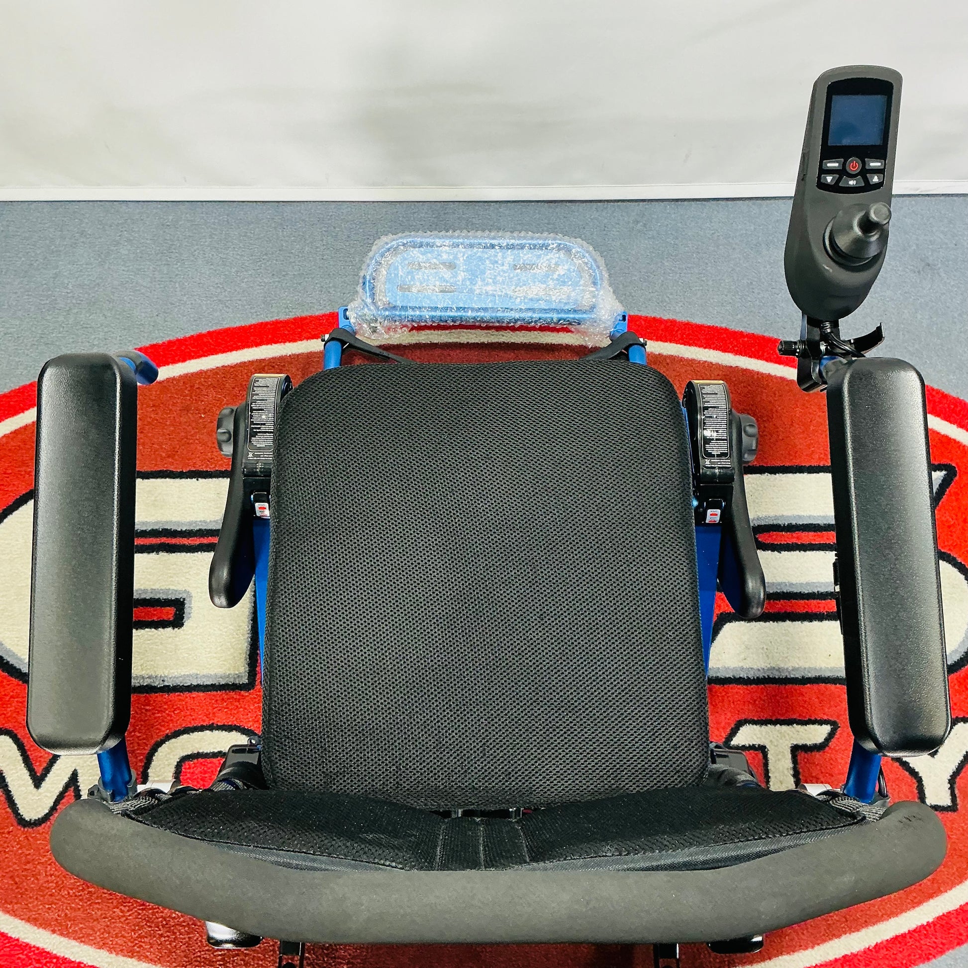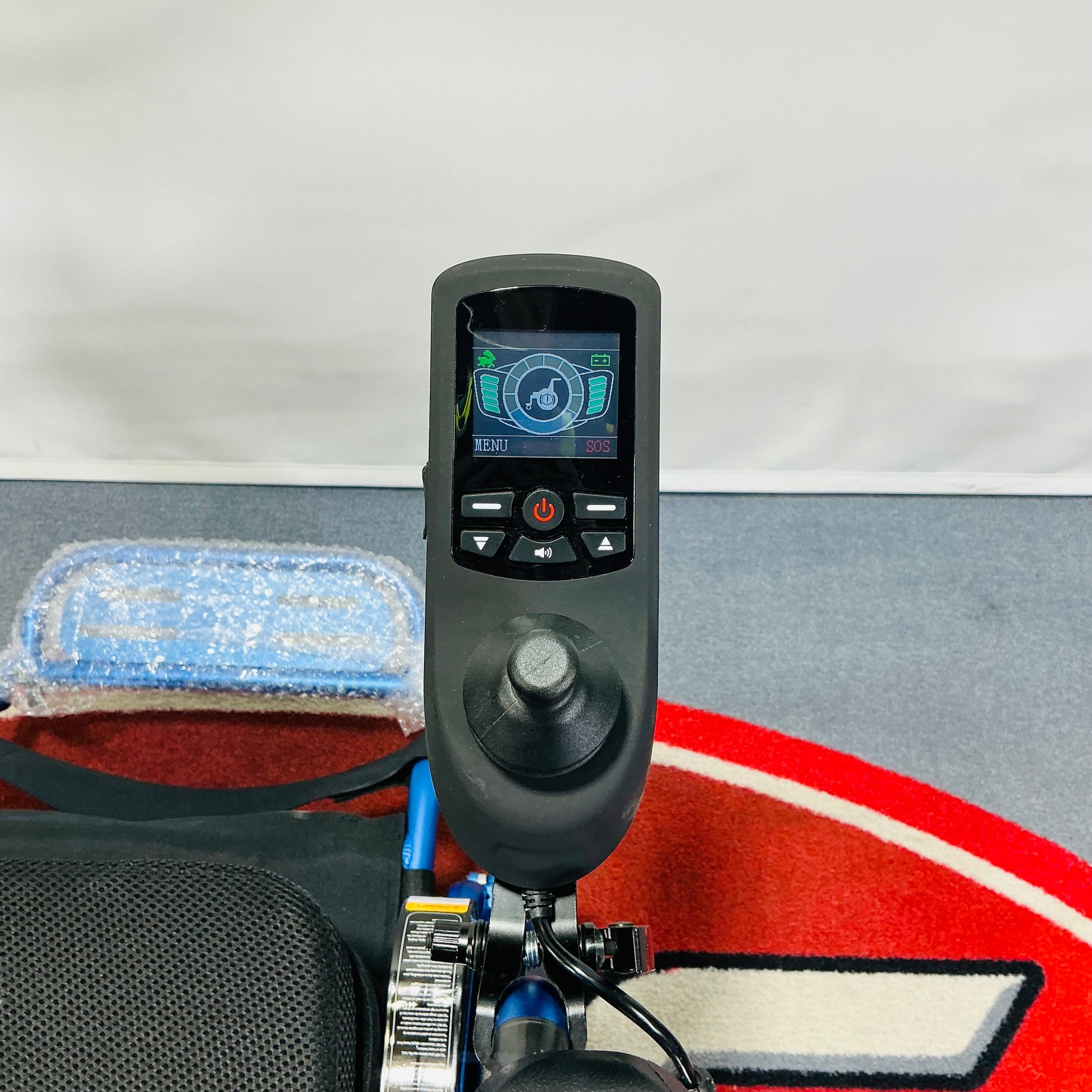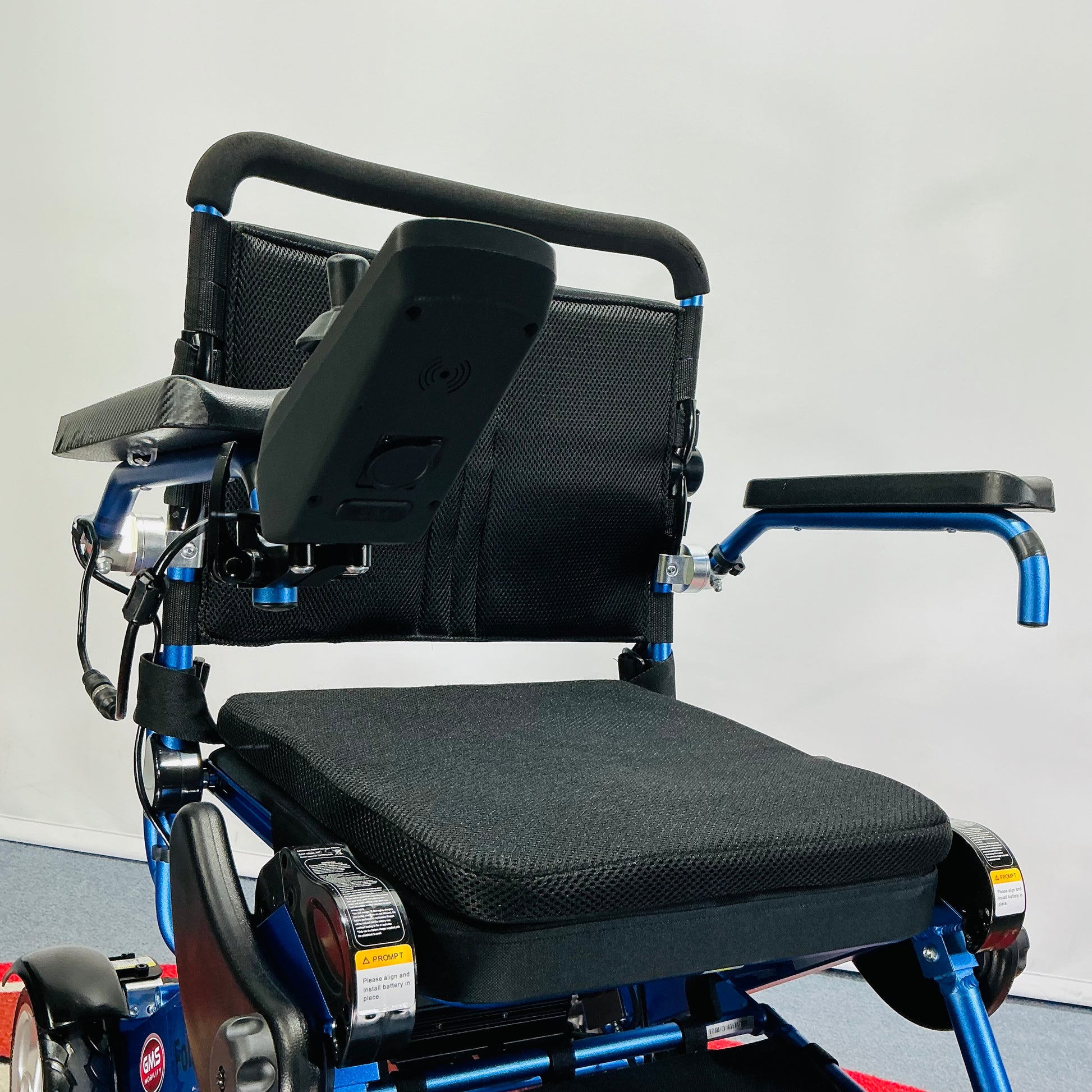 Unlike most folding powered wheelchairs, the Foldalite Pro has an advanced digital LCD joystick, with three drive profiles for use around different environments. The joystick can be mounted on either armrest, or alternatively on the backrest for an attendant to use.