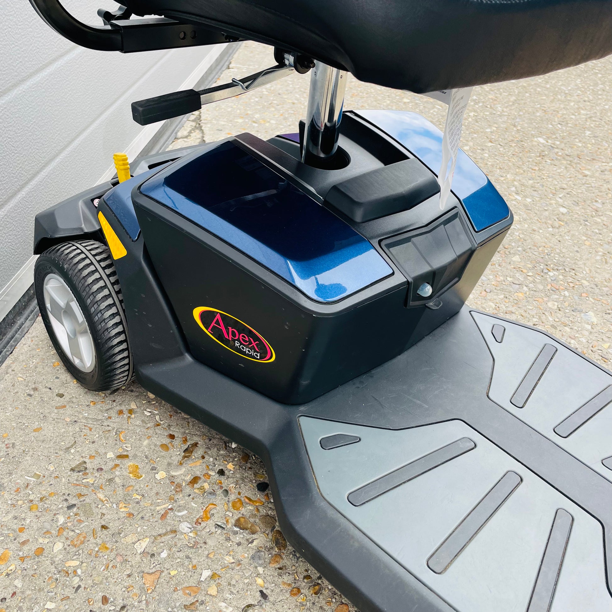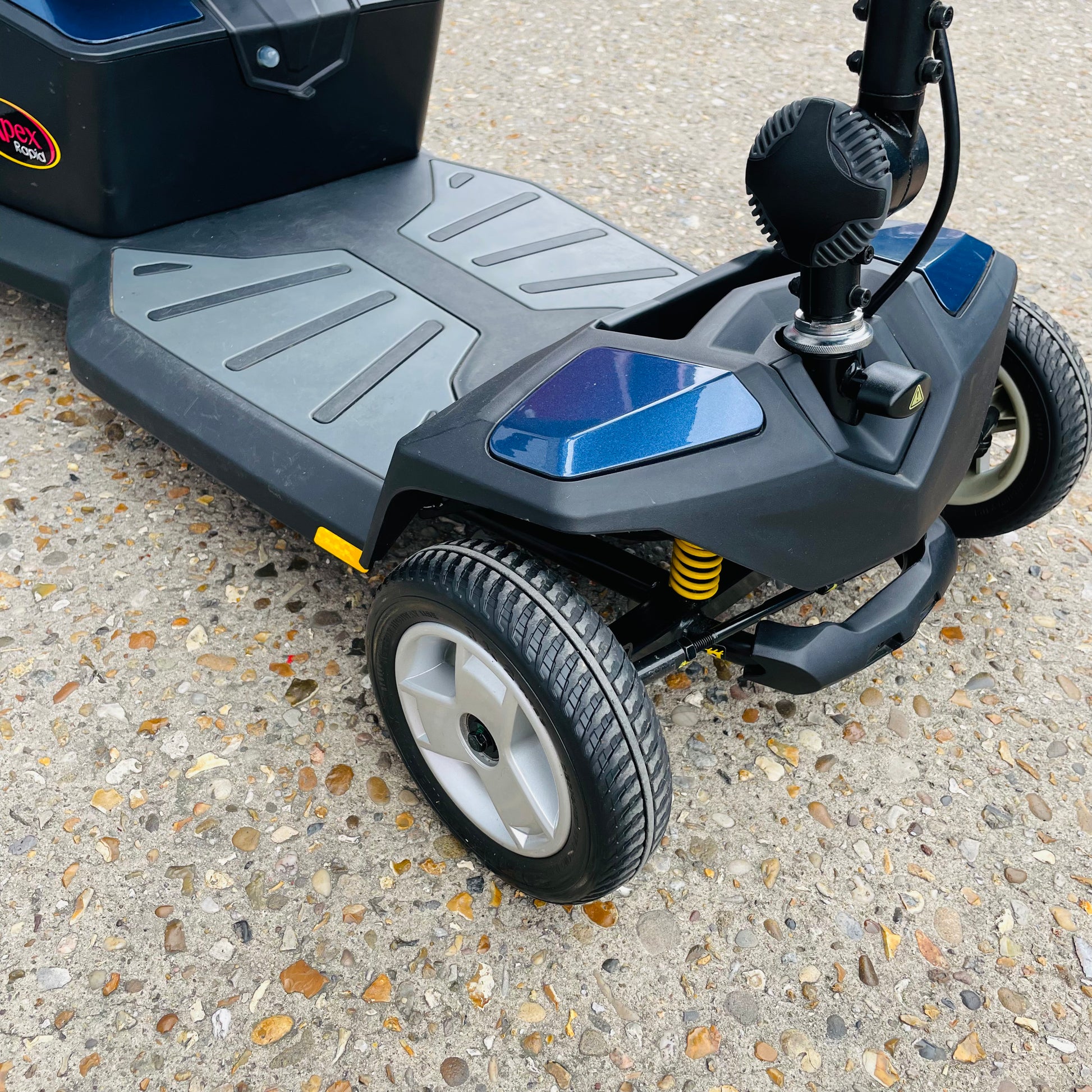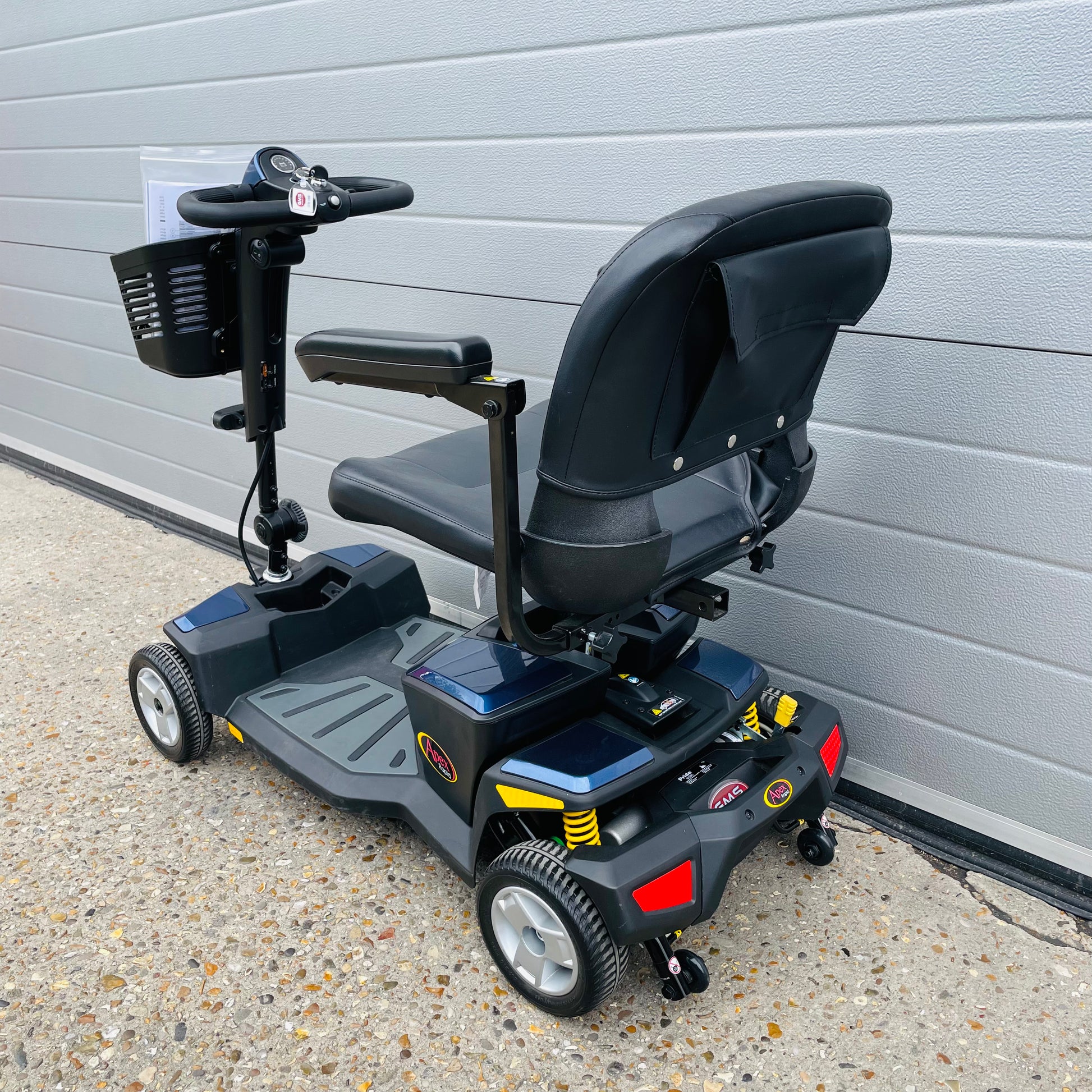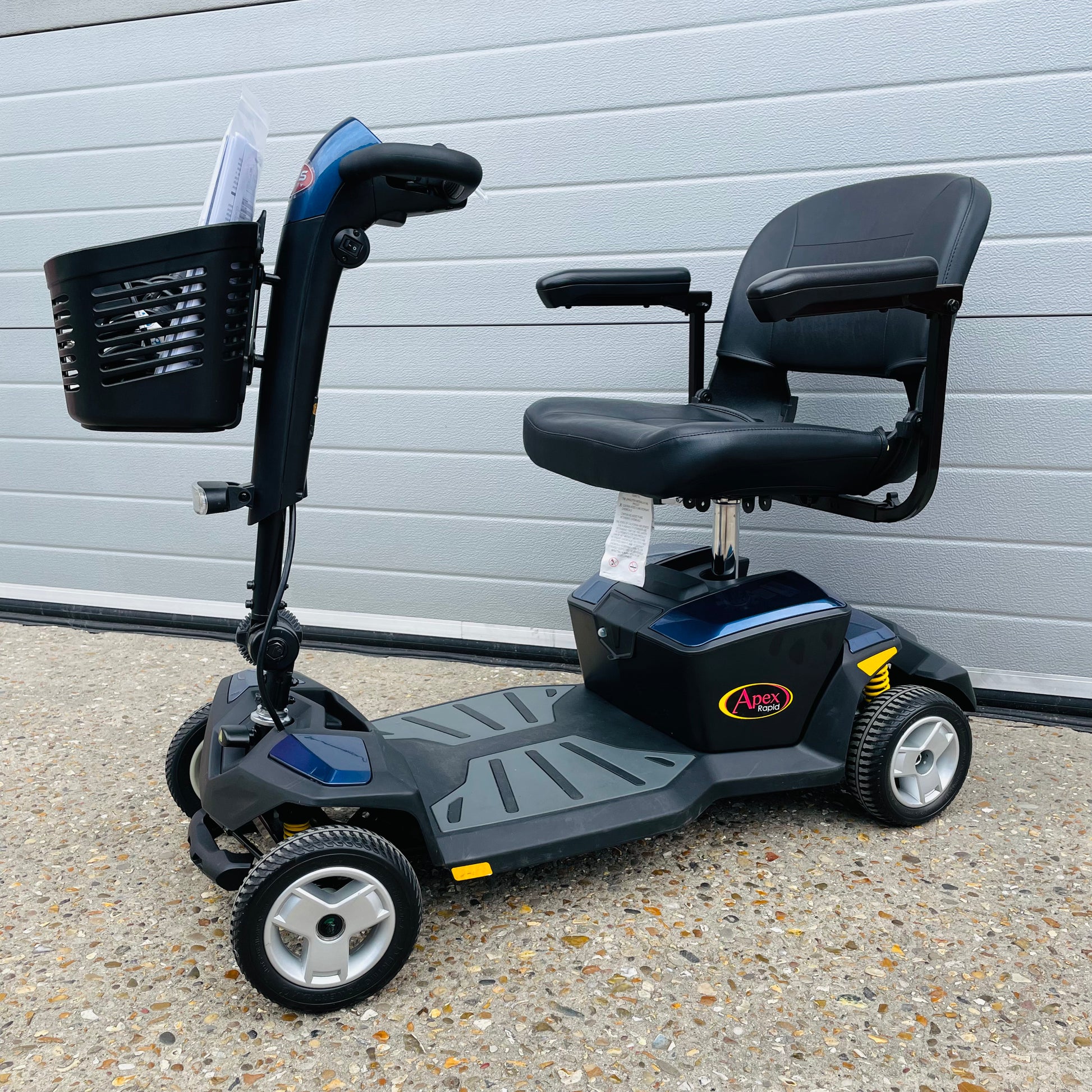 GMS Mobility is pleased to offer for sale, this fantastic value and very popular used 2021 (sold new in late 2022) Pride Apex Rapid, a transportable 4 mph pavement mobility scooter which comes fully tested with charger, fully tested batteries (in excellent order), front basket, user manual, Free nationwide fast delivery and a 6-month scooter warranty.