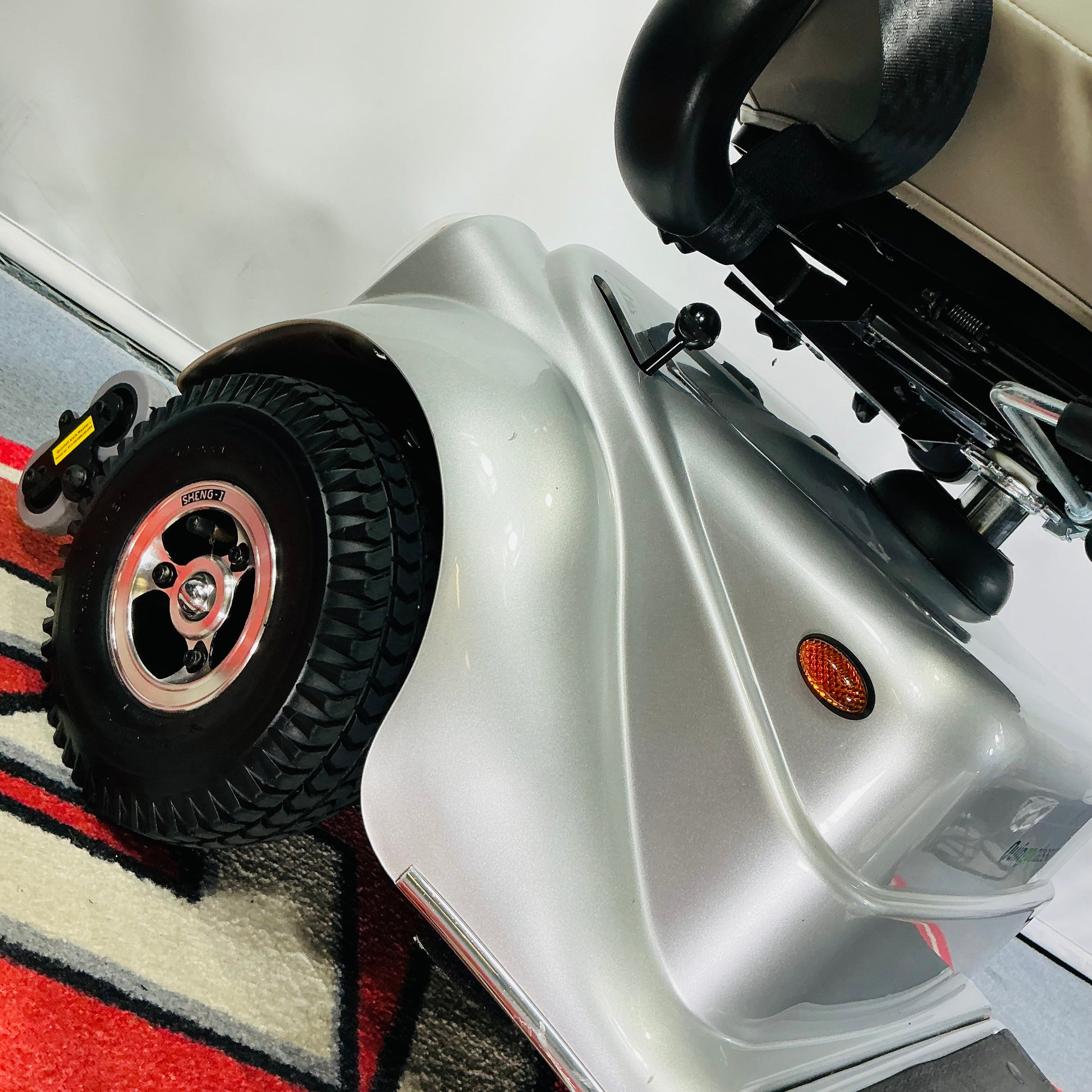 • No ordinary portable mobility scooter – Enhanced 5 wheel stability. The first generation, 3 wheel portable mobility scooters, while agile, are unable to match 4 wheel portables when it comes to stability. Using British designed 5 wheel Quintell™ technology makes for unrivalled stability, crucial for negotiating hills and slopes and when mounting or descending kerbs.